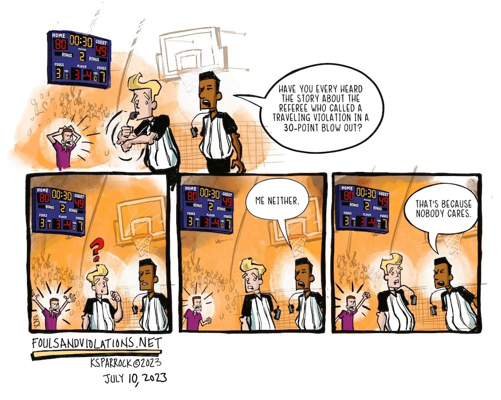 Basketball uniform rules are the ultimate “necessary evil” for referees—like enforcing a dress code at a party you weren’t invited to. Somehow, it falls on us to make sure a player’s jersey is tucked in, their undershirt is the right color, and their socks aren’t causing an existential crisis for the rulebook. Meanwhile, someone is out there committing a blatant travel, but no, heaven forbid we let a kid wear the wrong compression sleeves! It’s as if the game will collapse under the sheer weight of mismatched accessories. But hey, gotta keep the spirit of the game alive—one properly coordinated outfit at a time.
