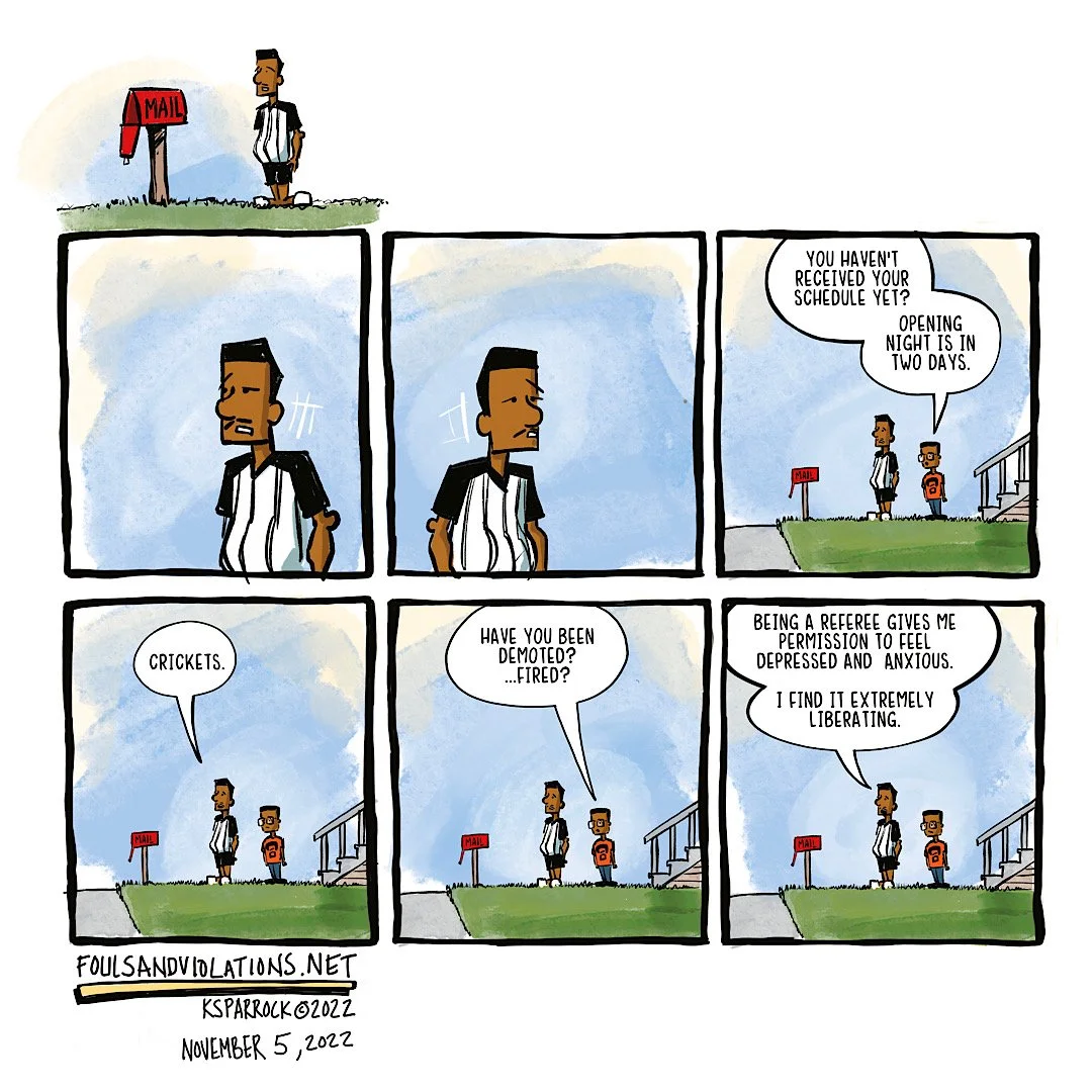 Kevin Sparrock is the artist and creator of Fouls and Violations, Life of a Referee Uncovered. He is a Brooklyn, New York native who has worked as a Graphic Designer and Illustrator for 30 years. He has officiated basketball for over 22 years. He has worked at the High School level, College Division 1 Men’s, College Division 1 Women’s, the NBA Developmental League, and the Woman’s National Basketball Association (WNBA). In 2008, he combined the blessings of two careers and created the first webcomic that chronicles the life of a sports official. Everything in the strip has happened or will happen in the future. Welcome to the referee life. Safe Traveling