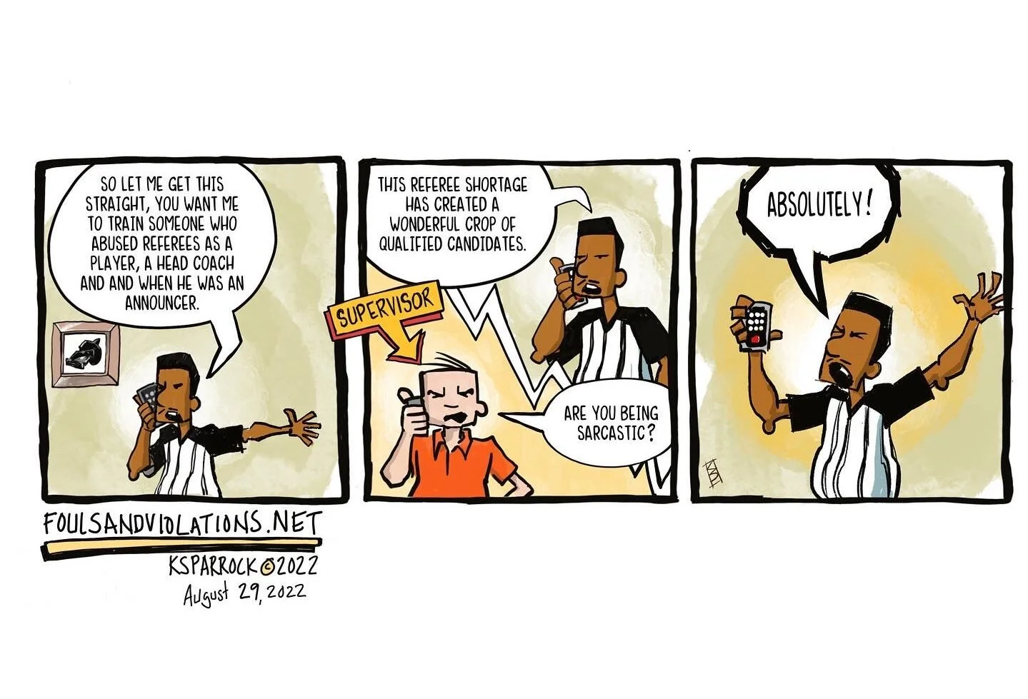 Kevin Sparrock is the artist and creator of Fouls and Violations, Life of a Referee Uncovered. He is a Brooklyn, New York native who has worked as a Graphic Designer and Illustrator for 30 years. He has officiated basketball for over 22 years. He has worked at the High School level, College Division 1 Men’s, College Division 1 Women’s, the NBA Developmental League, and the Woman’s National Basketball Association (WNBA). In 2008, he combined the blessings of two careers and created the first webcomic that chronicles the life of a sports official. Everything in the strip has happened or will happen in the future. Welcome to the referee life. Safe Traveling