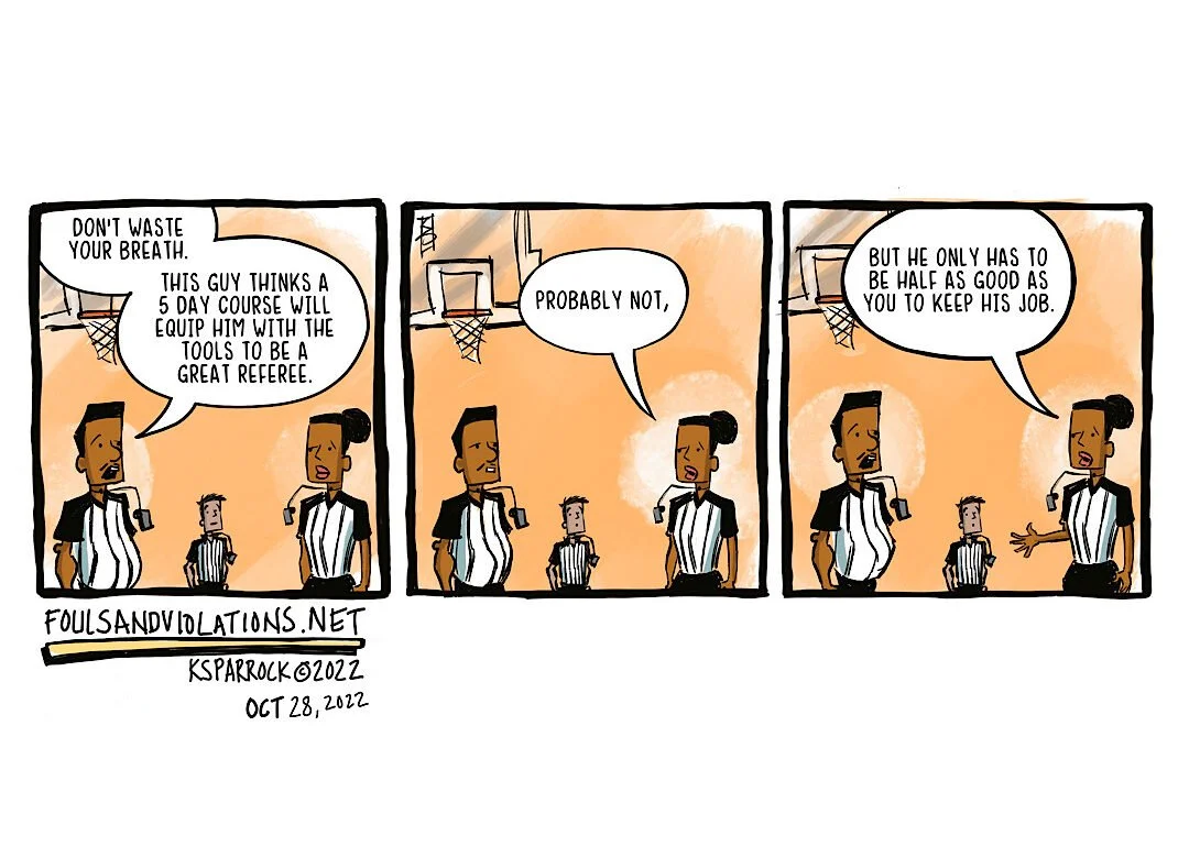 Kevin Sparrock is the artist and creator of Fouls and Violations, Life of a Referee Uncovered. He is a Brooklyn, New York native who has worked as a Graphic Designer and Illustrator for 30 years. He has officiated basketball for over 22 years. He has worked at the High School level, College Division 1 Men’s, College Division 1 Women’s, the NBA Developmental League, and the Woman’s National Basketball Association (WNBA). In 2008, he combined the blessings of two careers and created the first webcomic that chronicles the life of a sports official. Everything in the strip has happened or will happen in the future. Welcome to the referee life. Safe Traveling