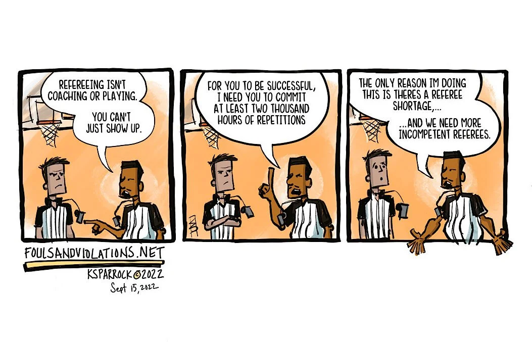 Kevin Sparrock is the artist and creator of Fouls and Violations, Life of a Referee Uncovered. He is a Brooklyn, New York native who has worked as a Graphic Designer and Illustrator for 30 years. He has officiated basketball for over 22 years. He has worked at the High School level, College Division 1 Men’s, College Division 1 Women’s, the NBA Developmental League, and the Woman’s National Basketball Association (WNBA). In 2008, he combined the blessings of two careers and created the first webcomic that chronicles the life of a sports official. Everything in the strip has happened or will happen in the future. Welcome to the referee life. Safe Traveling