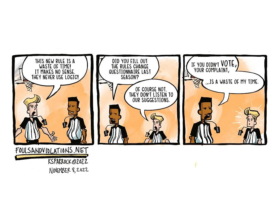 Kevin Sparrock is the artist and creator of Fouls and Violations, Life of a Referee Uncovered. He is a Brooklyn, New York native who has worked as a Graphic Designer and Illustrator for 30 years. He has officiated basketball for over 22 years. He has worked at the High School level, College Division 1 Men’s, College Division 1 Women’s, the NBA Developmental League, and the Woman’s National Basketball Association (WNBA). In 2008, he combined the blessings of two careers and created the first webcomic that chronicles the life of a sports official. Everything in the strip has happened or will happen in the future. Welcome to the referee life. Safe Traveling
